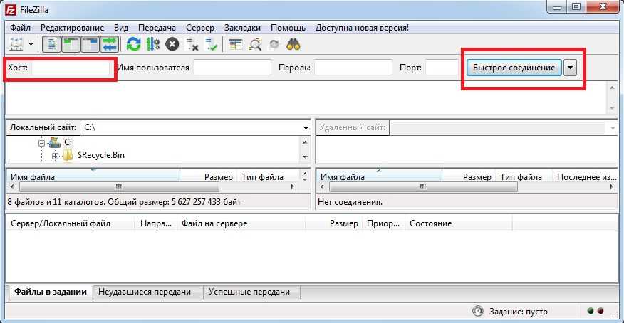 Окно программы FileZilla