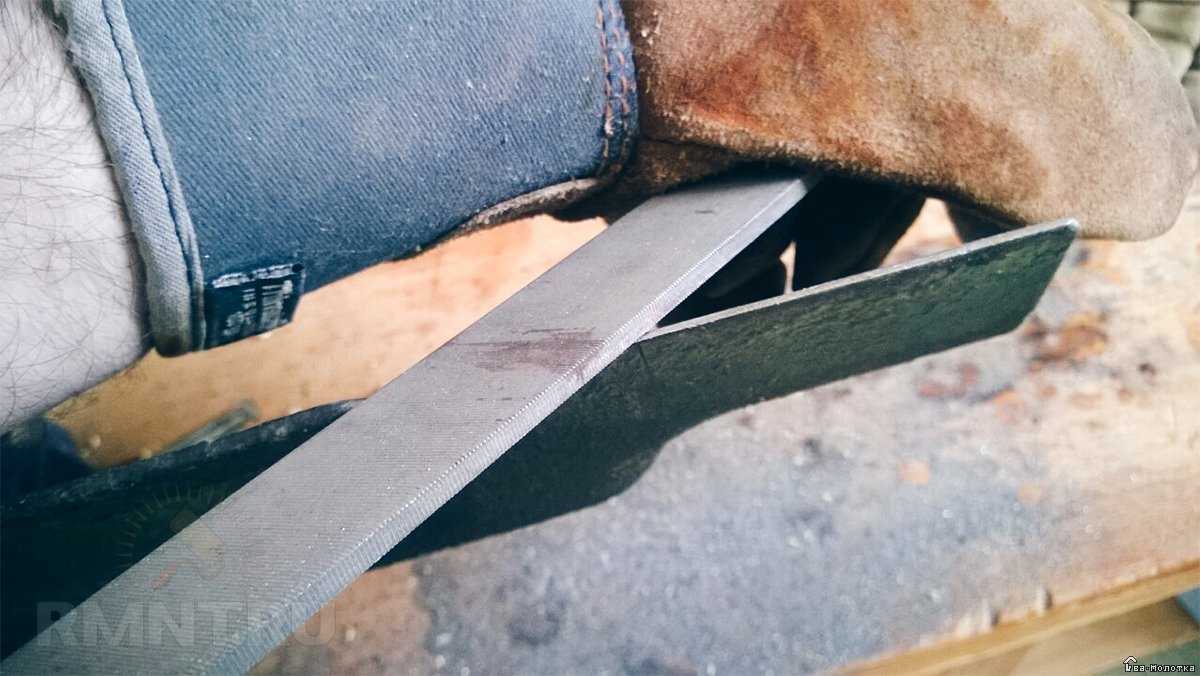 - Далее можно зажать нож в тисках и обработать при помощи напильника. Стоить заметить, что его режущая часть закалена и потому ваши действия должны быть аккуратны. Обрабатываем с помощью небольшого напильника только повреждённую часть. В случае когда случайно погнули нож, положите его на твёрдое и ровное место, и затем выровняйте молотком. С помощью напильника счистите большие заусенцы, а мелкие удалите бруском. Брусок должен двигаться от себя с центра ножа до края. Как будто точим косу. Можно также затачивать на электрических станках, только не сточите много, а то придётся выбросить нож – он может сломаться при работе.