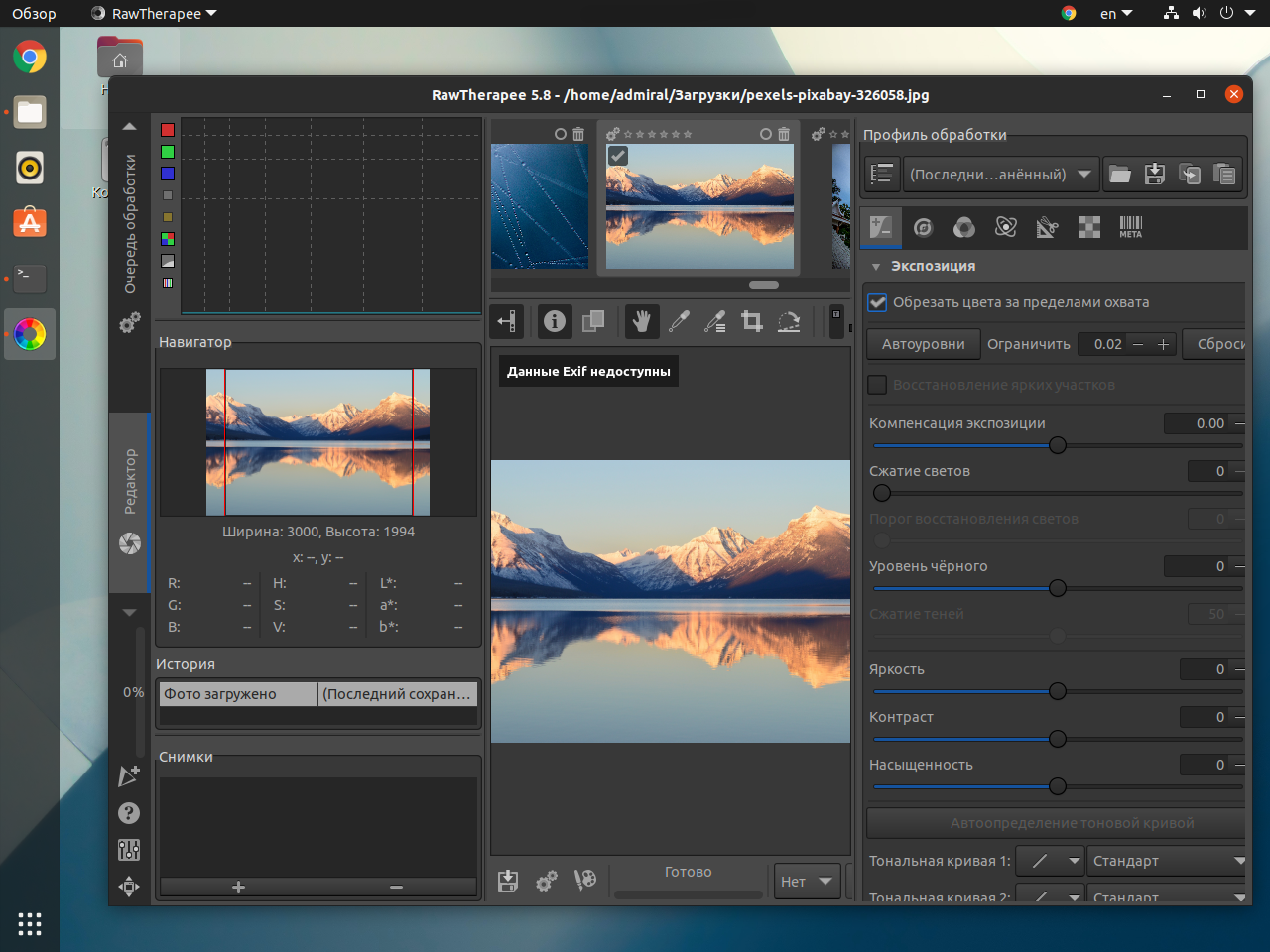 Ещё одной программой для проявки снимков будет RawTherapee. В ней представлено большое количество настроек, причём часть из них будет полезна только профессионалам. В конечном счёте можно получить снимок того же качества, что и в Lightroom. Для установки RawTherapee используйте команду: