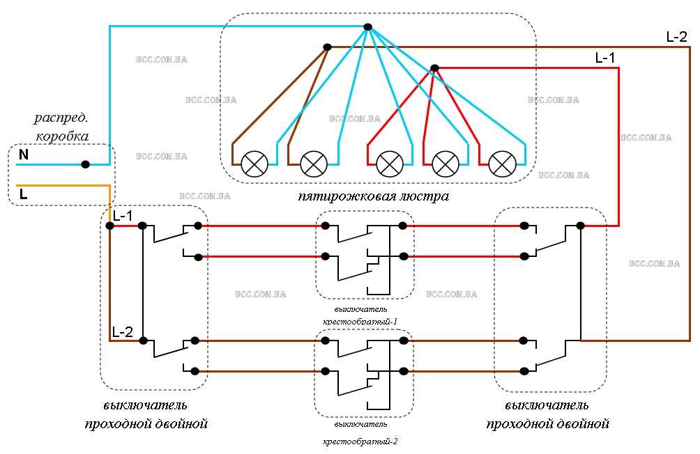 В подобной схеме на первой и последней точке управления освещением применяются обычные проходные выключатели, тогда как на всех остальных пунктах задействуются перекрестные переключатели. Число мест управления группами осветительных приборов неограниченно, но с каждой дополнительной точкой осложняется расключение в распредкоробке вследствие большого количества проводов. Для облегчения работ необходимо промаркировать провода, чтобы впоследствии не запутаться в них.