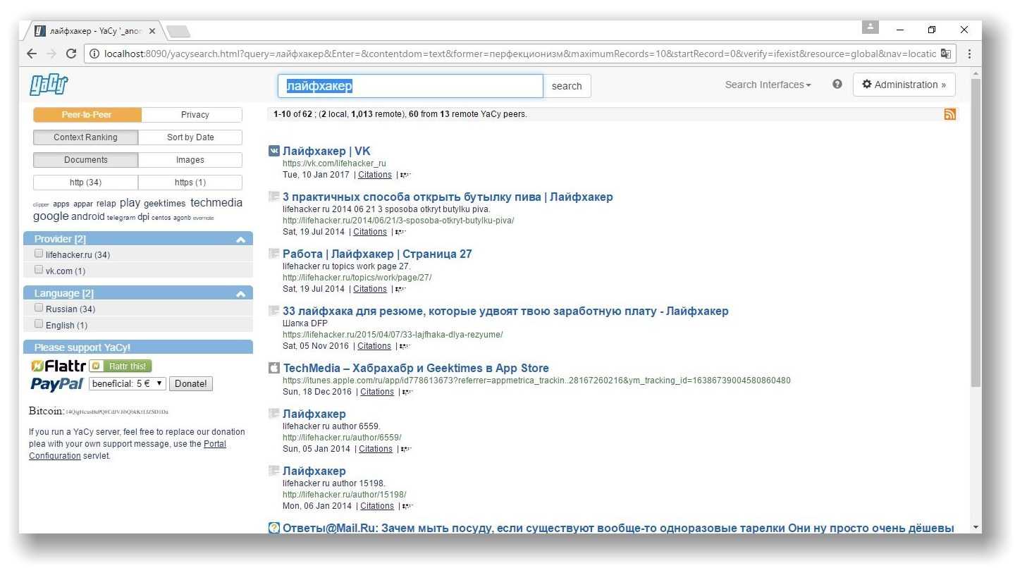 Если вы сторонник открытого ПО и свободного интернета, не подверженного влиянию государственных органов и крупных корпораций, то YaCy — это ваш выбор. Также с его помощью можно организовать поиск внутри корпоративной или другой автономной сети. И пусть пока в быту YaCy не слишком полезен, он является достойной альтернативой Google с точки зрения процесса поиска.