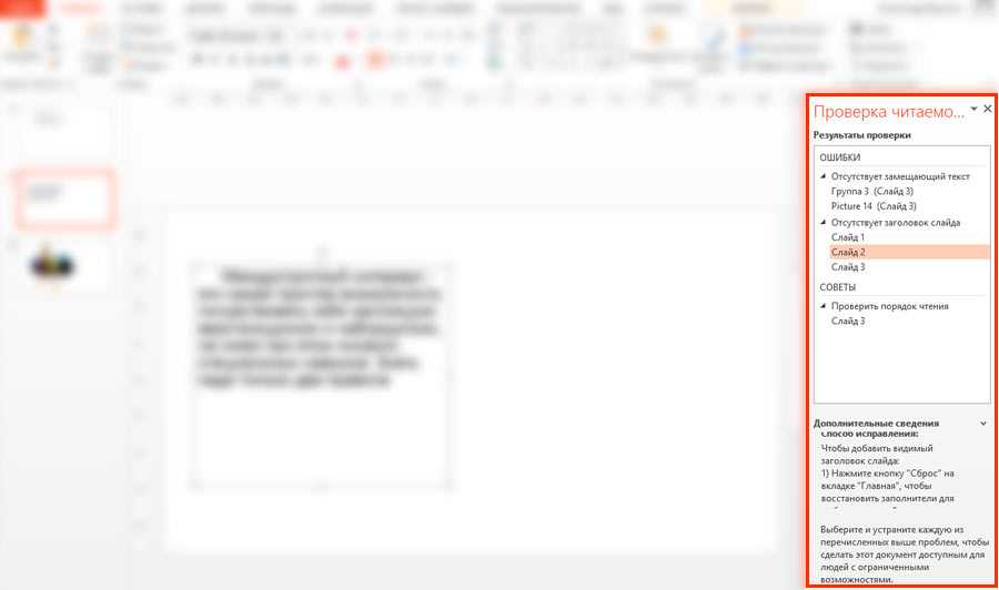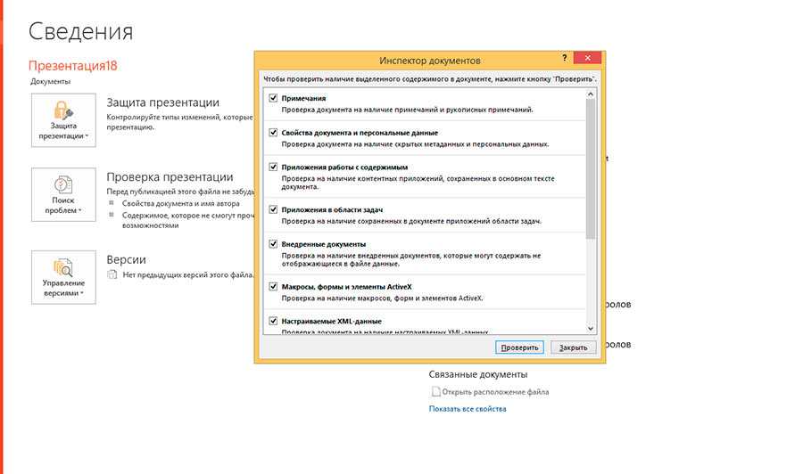 — в автоматическом режиме «прогоняет» вашу презентацию на наличие типовых ошибок. Например, проверяет, не оставлены ли некоторые объекты невидимыми, не забыли ли вы убрать примечания, а также нет ли в файле презентации внедренных документов, которые при показе вашего слайдшоу на другом компьютере, могут оказаться недоступными.
