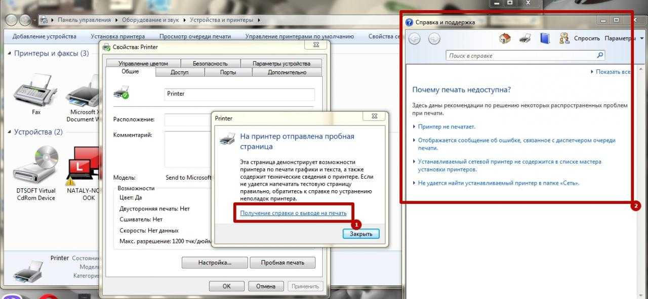 Если аппарат печатает медленно либо не реагирует на команду, то используйте рекомендации из справки от службы поддержки Windows. Для этого нажмите на строку, которая появляется в окне при отправке пробного листа.