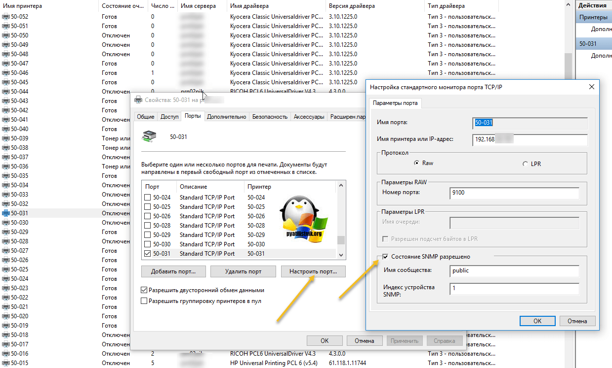 Далее выберите нужный порт и нажмите кнопку «Настроить порт». В открывшемся окне «Настройка стандартного монитора порта TCP/IP» снимите галку «Состояние SNMP разрешено» и сохраните настройки.