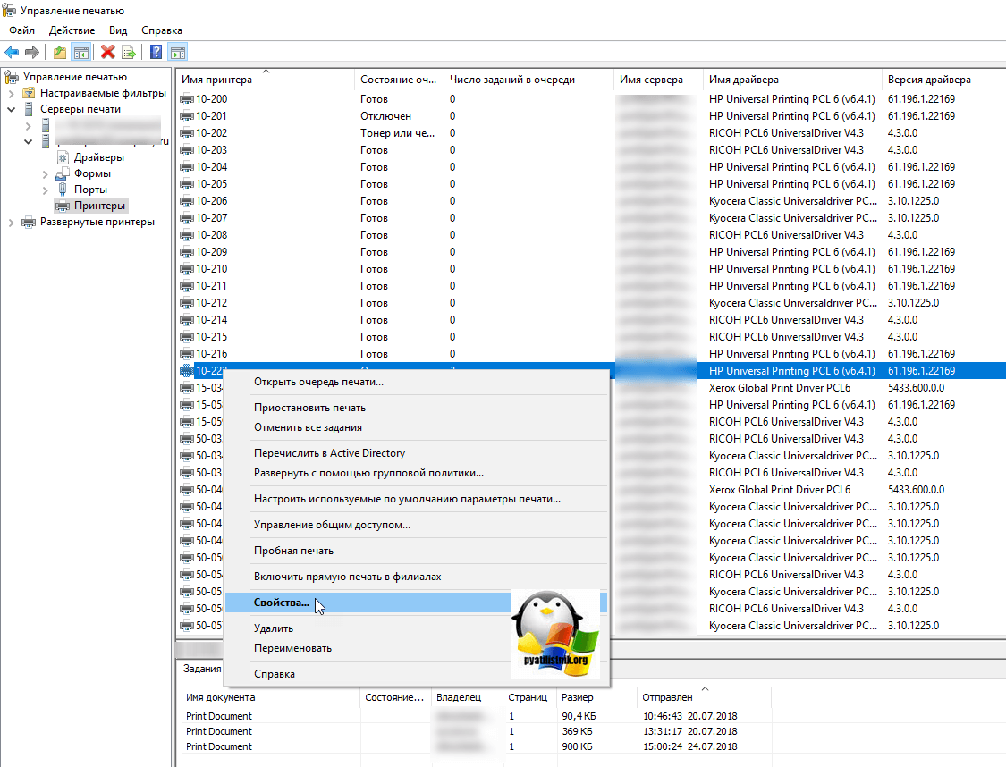 Для того, чтобы проверить является ли это причиной неисправности, вам нужно выполнить вот такие шаги. Откройте оснастку управление печатью и перейдите в свойства нужного принтера.