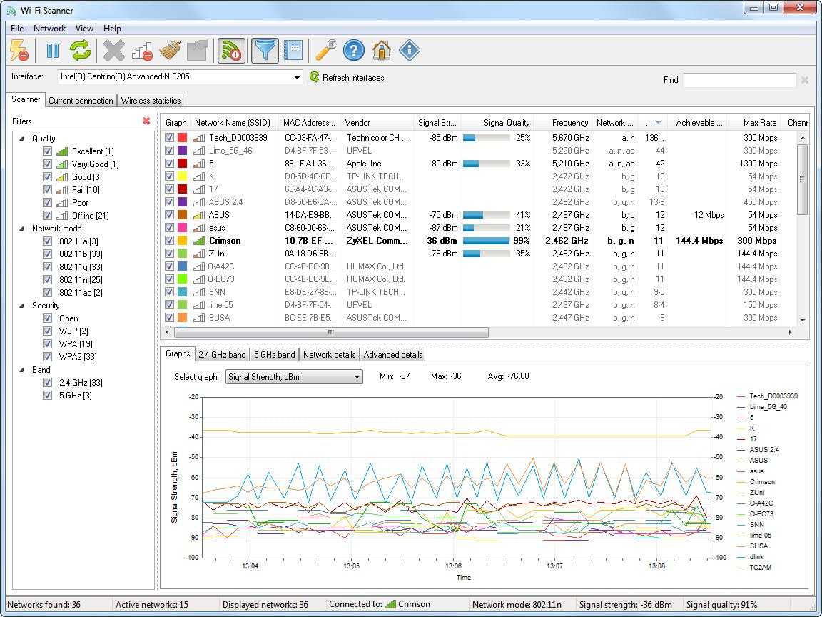 Приложение имеет современный графический интерфейс, интуитивно понятный и легкий в использовании. На вкладке «Сканер» представлен список обнаруженных SSID. Помимо стандартной детальной информации здесь вы также найдете значения уровня сигнала как в отрицательных значениях дБм, так и в процентах. Тут даже показано количество клиентов, которые подключены к каждому SSID. Также, наряду со спецификацией стандартов 802.11, решение может определять и сообщать о нескольких каналах, используемых любыми SSID с большей шириной канала.