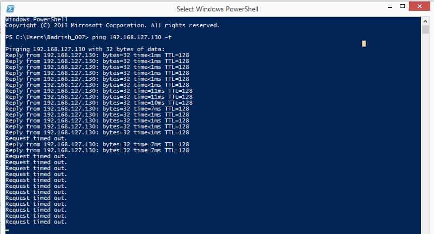 - Откройте командную консоль и введите ping –t XXX.XXX.XXX.XXX где X представляют IP-адрес V4 целевого хоста в сети, который будет использоваться для теста.