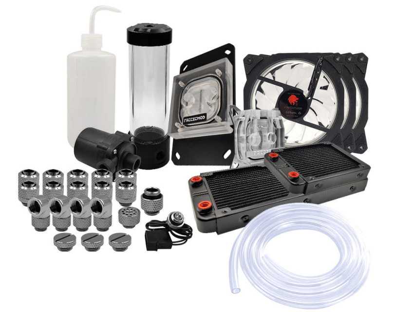 Корпус для ПК с водяным охлаждением должен обзавестись ватерблоком. Как показывает практика, хватает и одного, но лучше больше. Также внутри должен быть радиатор, помпа, шланги, фитинги и вода.
