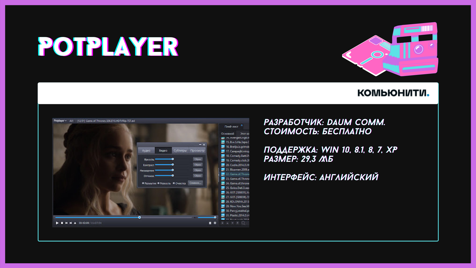 Широкое распространение (сегодня этот медиа плеер можно установить практически на любое устройство независимо от его платформы и назначения)