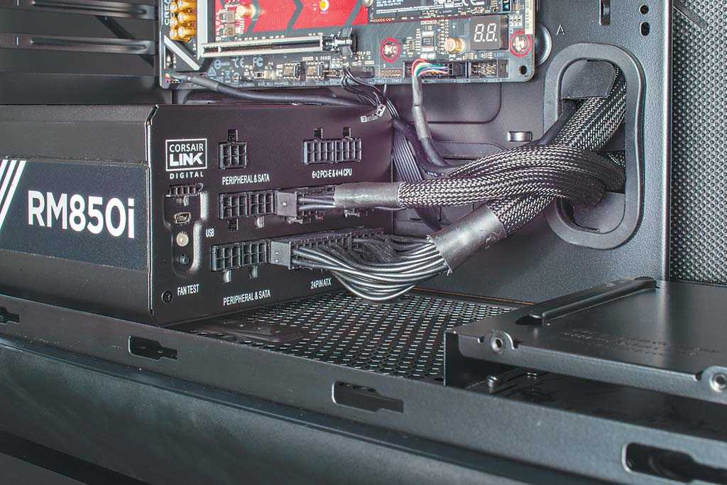 В качестве источника питания мы использовали модель RM850i компании Corsair, мощность которой (850 Вт) обеспечивает достаточный резерв. Благодаря его связи с ПО Corsair Link можно осуществлять контроль и управление основными характеристиками. В качестве кулера процессора мы временно установили недорогой EKL Eco. Однако он стабильно и с приемлемым уровнем шума целую ночь охлаждал десятиядерный процессор, действовавший под полной нагрузкой; работал он во взаимодействии с тремя вентиляторами корпуса (два из них расположены снизу на передней части — на всасывание, один — сверху на задней крышке — для удаления горячего воздуха).