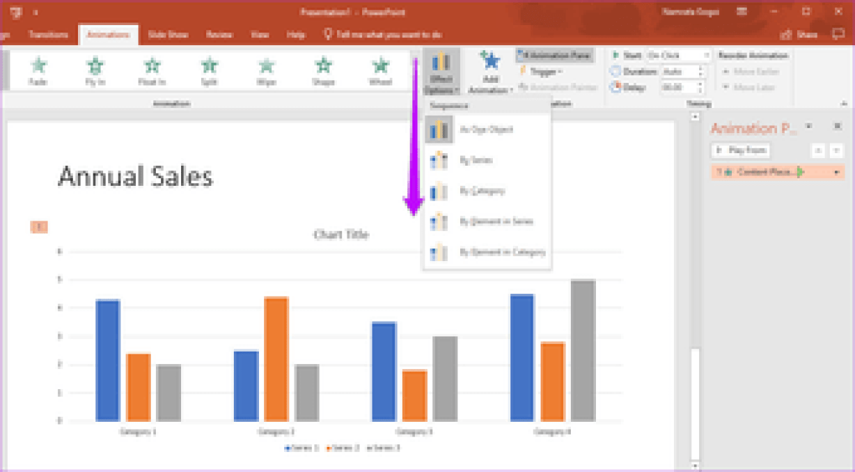 Когда диаграмма будет готова, щелкните ее, чтобы выбрать, а затем добавьте анимацию по вашему выбору. Затем нажмите «Параметры эффекта» и выберите стиль. By Series — один из лучших вариантов.