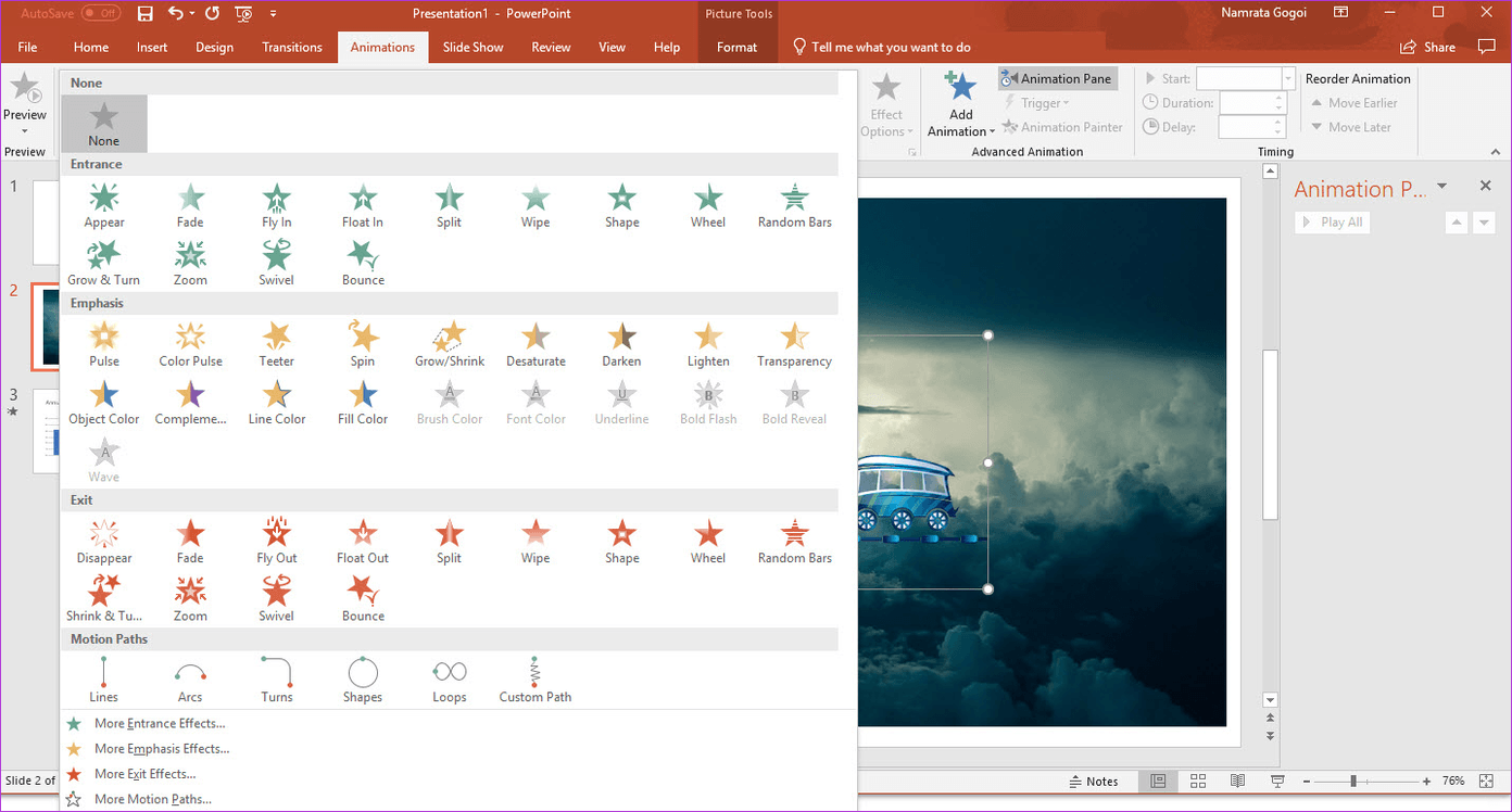 Вы можете увидеть еще больше анимации, щелкнув Дополнительные эффекты входа на этой панели.