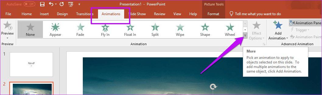 Чтобы проверить типы анимации, выберите элемент, который вы хотите анимировать, и нажмите на вкладку Анимация в верхней части. Затем нажмите на маленький значок стрелки вниз, как показано на скриншоте ниже, чтобы увидеть все стили.