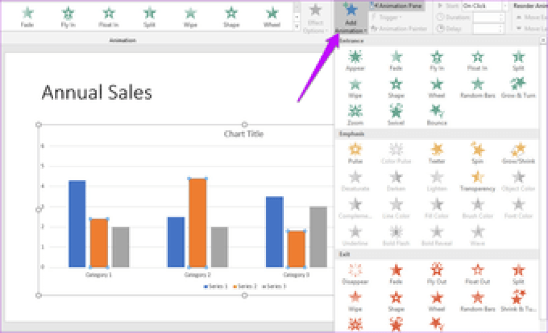 В дополнение к стандартным анимациям диаграмм, которые отображаются в меню, вы можете просмотреть дополнительные анимации входа, выхода и выделения, щелкнув стрелку вниз в конце списка анимаций.