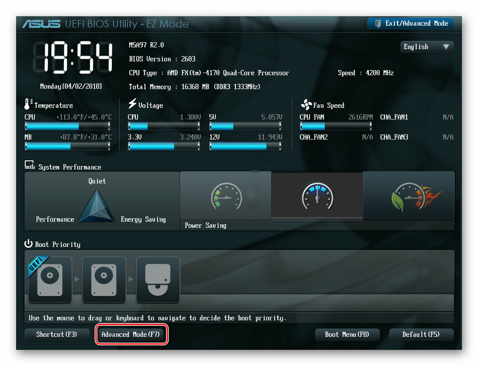 - Заходим в БИОС, нажав Del или F2. Реже встречаются другие сервисные клавиши, узнать их можно в документации или из подсказки внизу экрана. Далее переходим в «Advanced Mode», нажав F7.