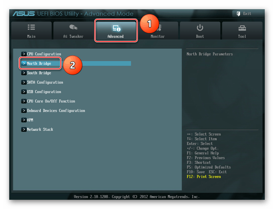 Затем выходим в окно расширенных настроек и передвигаемся во вкладку «Advanced». Там посещаем «North Bridge», страницу северного моста материнской платы.