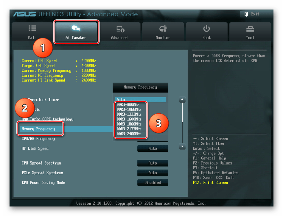На странице расширенных настроек переходим на вкладку «Ai Tweaker», находим параметр «Memory Frequency» и в выпадающем окне выбираем желаемую тактовую частоту оперативной памяти.