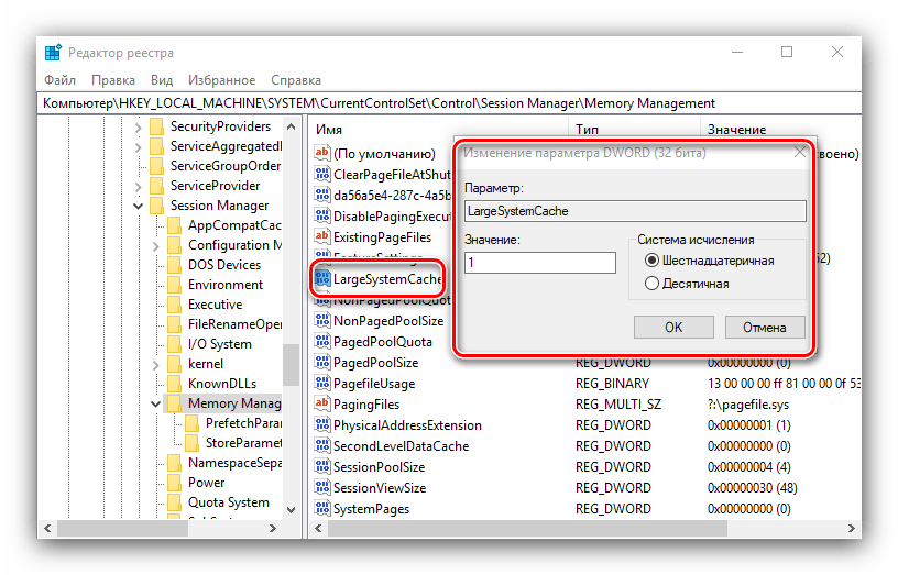 Следующий параметр, который нам нужно отредактировать, называется LargeSystemCache. Измените его точно так же, как и предыдущий, с тем же значением.