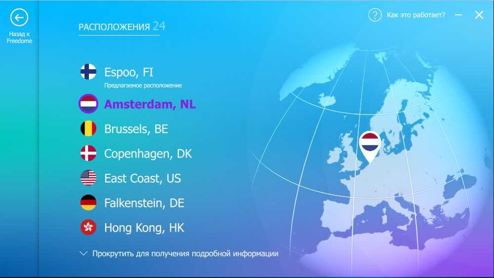 Европа Серверы в Европе соответствуют строгим требованиям к защите данных. Таким образом, для максимальной безопасности необходимо пользоваться VPN-узлами стран Еврозоны