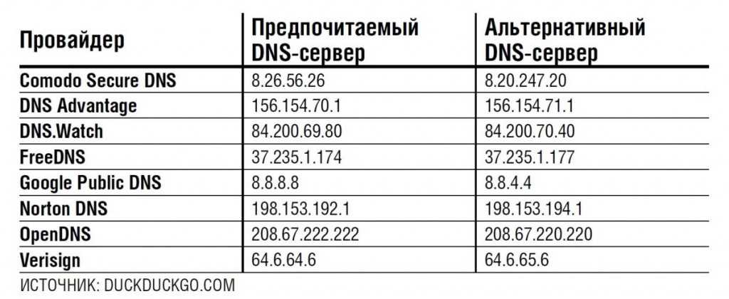 Ниже представлены публичные DNS-серверы. IP-адреса для предпочитаемых и альтернативных серверов можно комбинировать, использовав параметры от двух различных провайдеров для большей надежности.