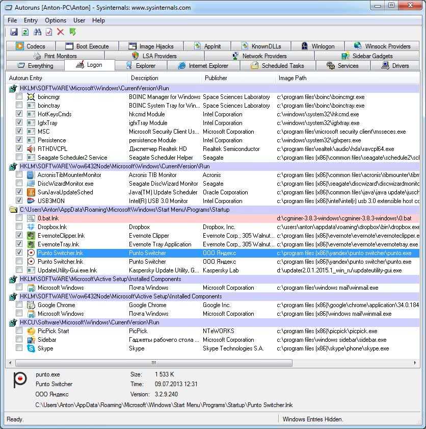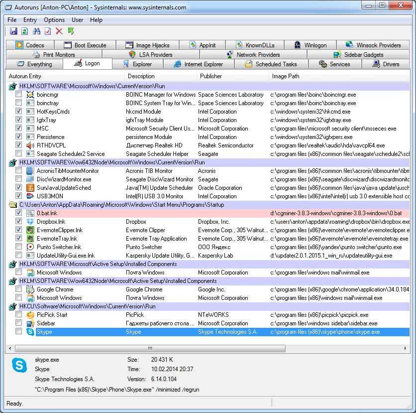 Под нож пошли распределенные вычисления (так как они все равно будут стоять в паузе до простоя компьютера), утилиты от Seagate, Acronis, Punto Switcher. Погода (гаджеты рабочего стола) меня тоже не интересует сразу после включения компьютера вместе со Skype и PicPick.