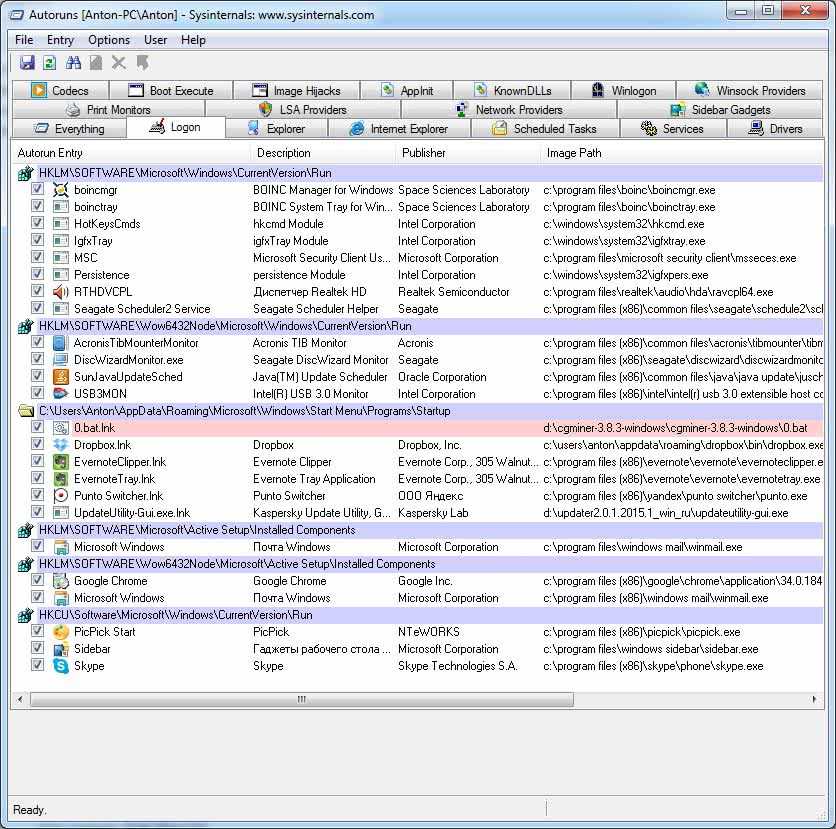 Запускаем autoruns.exe и переходим на вкладку Logon