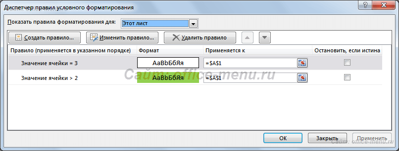 Рассмотрим еще один случай, когда требуется выполнить только одно условие. В конце каждого правила имеется флажок «Остановить, если истина». Выставив его, Вы отменяете выполнение всех последующих правил для текущего диапазона, при условии, что это оно выполняется. Исходя из рассматриваемого примера, если ячейка содержит значение 3, то проверка на условие «больше двух» произведена не будет.