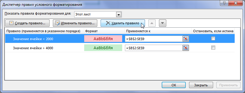 Диспетчер правил условного форматирования отображает список, состоящий из условия, формата и диапазона, к которому применено правило.