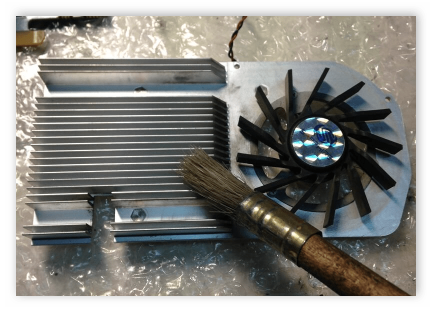 Для чистки потребуется мягкая кисть. Разбирать систему охлаждения не рекомендуется, так как лопасти очень хрупкие, можно их повредить. Но при сильных загрязнениях избежать этого этапа не удается.