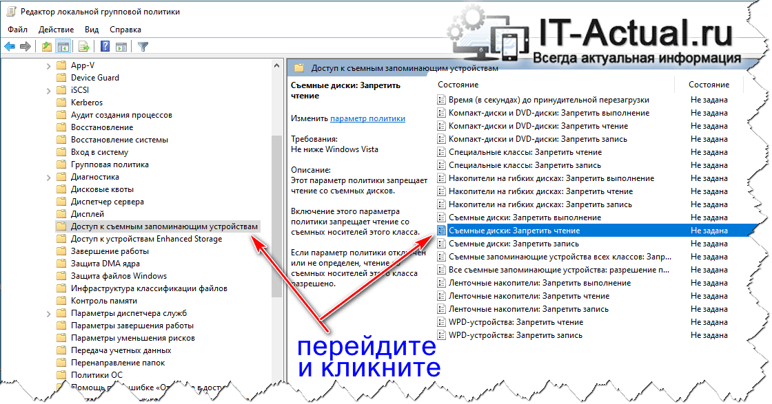 И в правой части окна среди прочих будет располагаться пункт с именем Съемные диски: Запретить чтение – осуществите двойной клик по нему.
