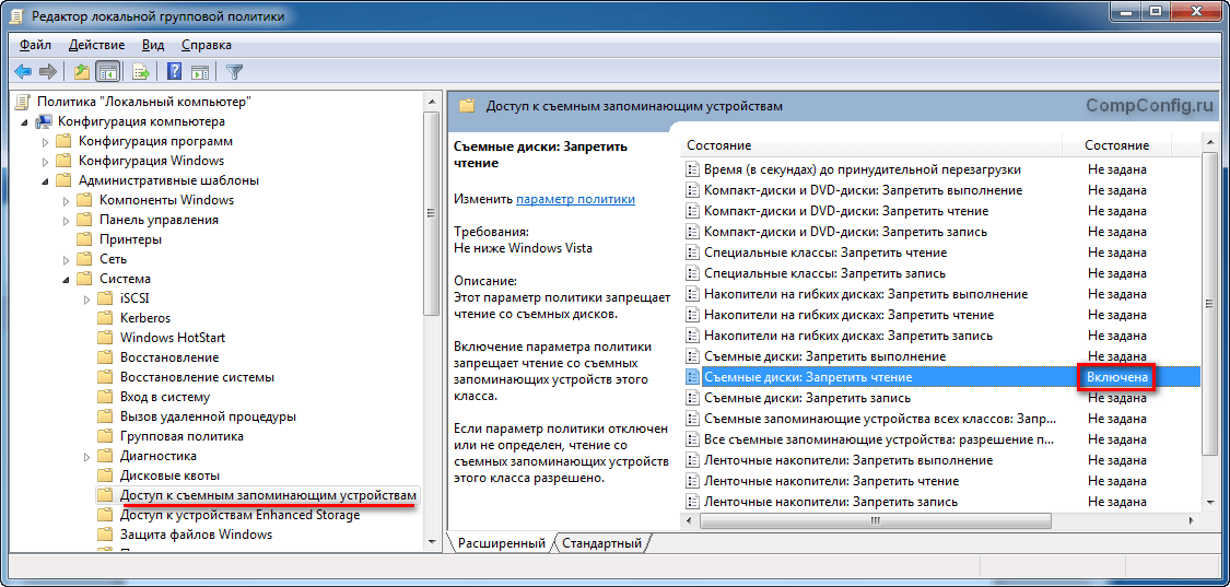 через окно «Выполнить»(Win + R). - Перейдите к следующей ветви «Конфигурация компьютера -> Административные шаблоны -> Система -> Доступ к съемным запоминающим устройствам