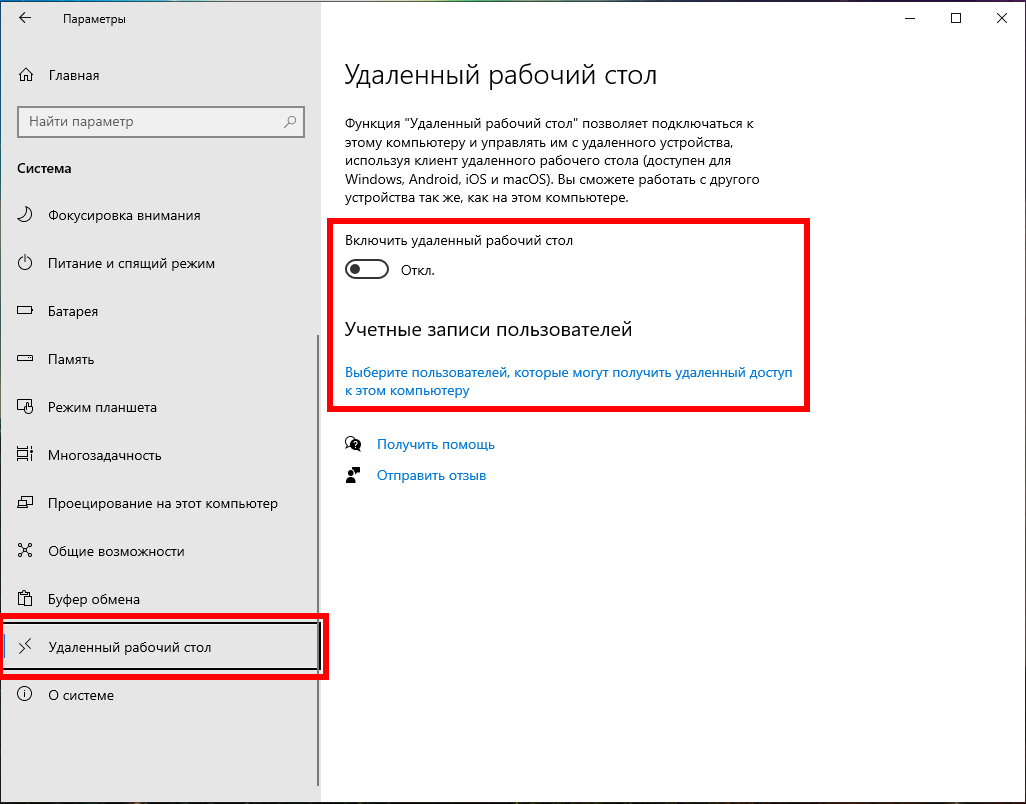 На вкладке «Удалённый рабочий стол» включите соответствующий ползунок. Также вы можете выбрать пользователей, которые могут подключаться удалённо к компьютеру.