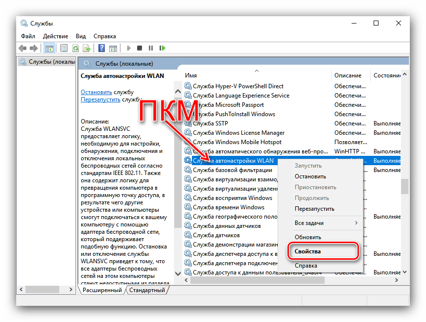Появится окно оснастки «Службы». Отыщите в перечне позицию «Служба автонастройки WLAN», вызовите контекстное меню нажатием правой кнопки мыши, в котором кликните по пункту «Свойства».