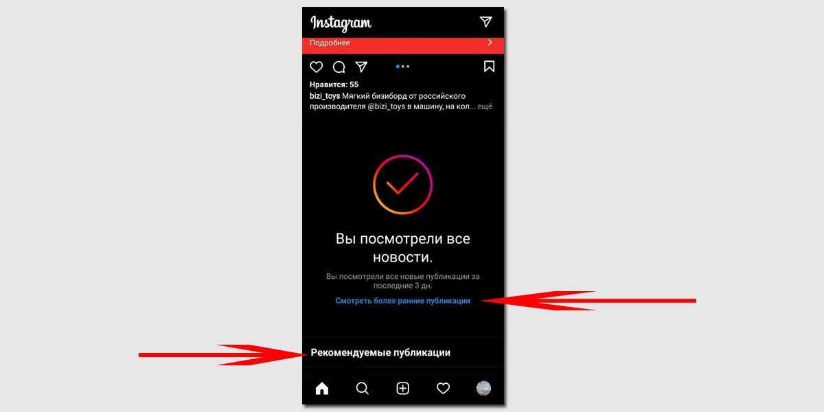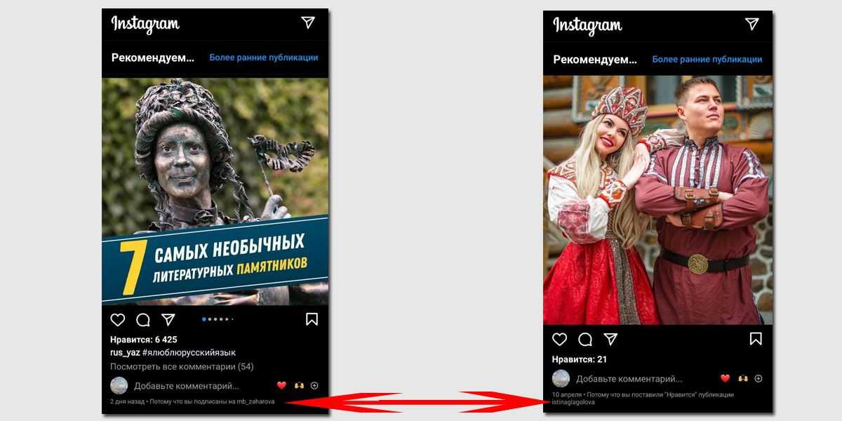 В рекомендованном в ленте Инстаграма видно, какой просмотренный контент послужил показу вам той или иной «навязанной» публикации. Когда закончите листать свежие посты из аккаунтов, на которые подписаны, увидите сообщение: