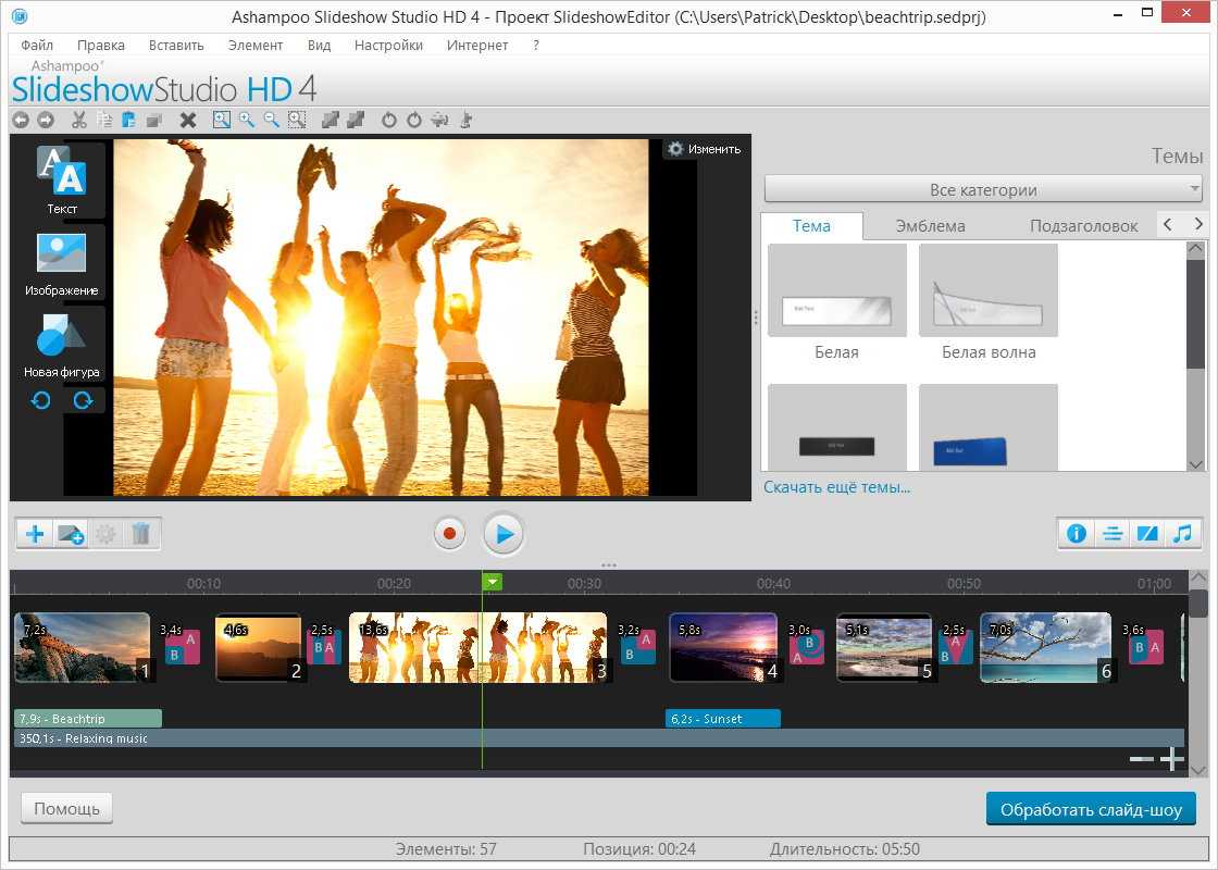 - Для создания слайд-шоу достаточно просто перетащить мышкой нужные фотографии в окно данной программы и уточнить, какие именно эффекты следует использовать при переходе от одного изображения к другому. При желании, помимо прочего, можно добавить тексты и различные формы.