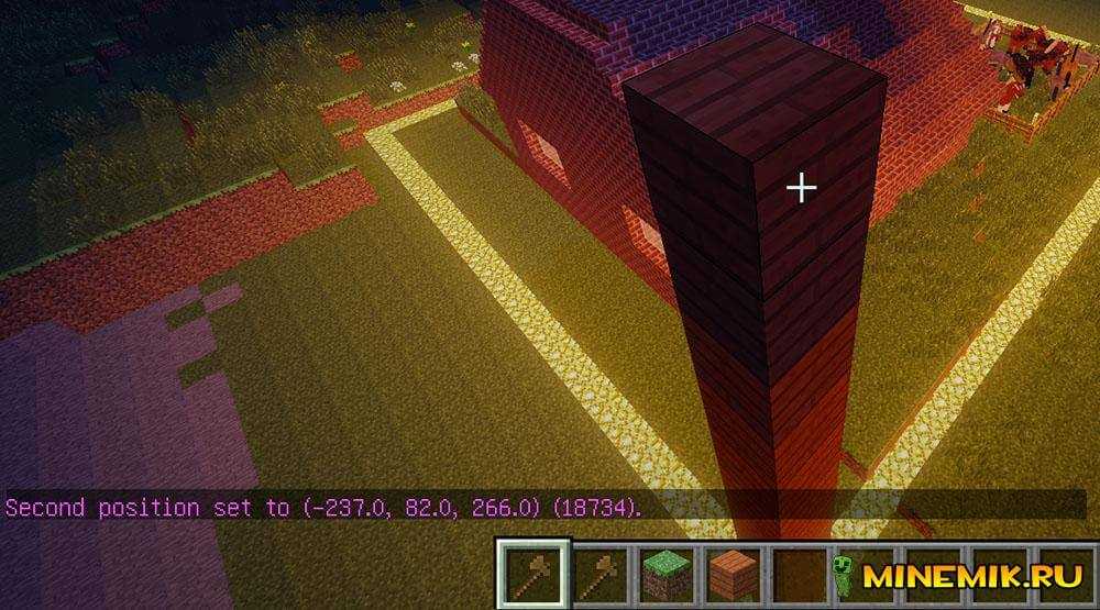 Значит там где down — отмечает 20 кубиков вниз, а там где up — то 20 кубиков вверх. Высота и глубина (числа) можете писать под себя. Многие наверное думать: а зачем в глубину и в высоту отмечать, если есть пол и крыша. Ответ прост: есть гриферы, которые выкопают под вами яму к примеру или еще что. а так вы защитите свое жилье полностью от всех. Еще один не менее легкий способ заприватить территорию. Встаем на низкую точку и пишем в чат //pos 1, переходим к высокой точки и пишем //pos 2. Они отмечают регион так же, как и топорик, но только командами. А главный плюс, куда направлен наш прицел, то и будет отмечено. Правило номер один: выделять точки, только по диагонали.