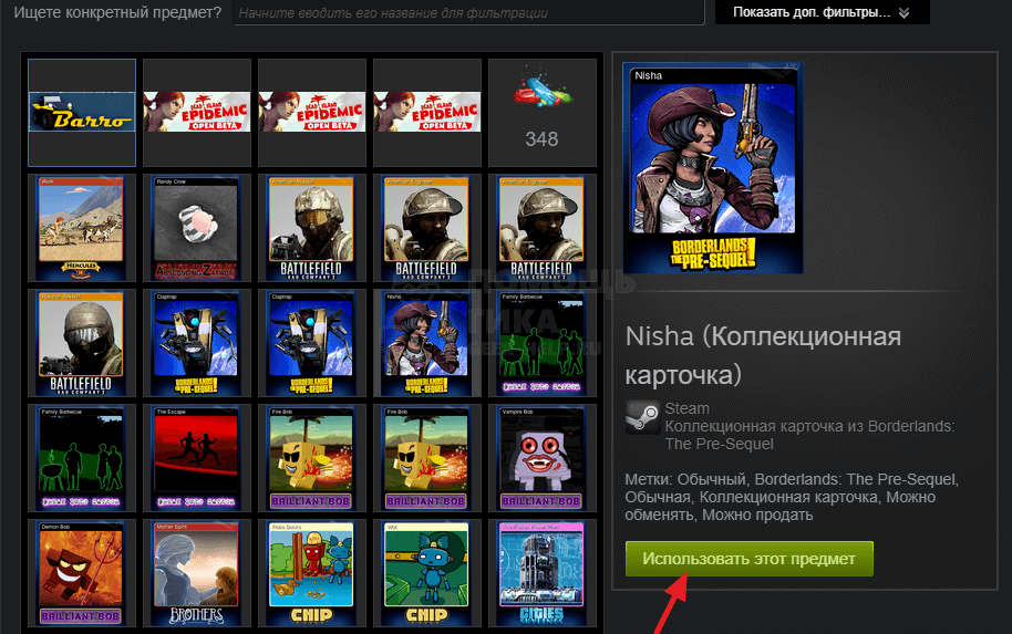 Откроется во всплывающем окне инвентарь. Выберите один из предметов в инвентаре и нажмите “Использовать этот предмет”, чтобы он был установлен в качестве одного из предметов на витрине.