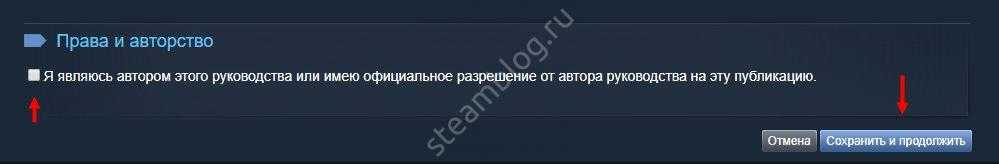 Поставьте галочку в разделе «Права и авторство», нажмите «Сохранить и продолжить».