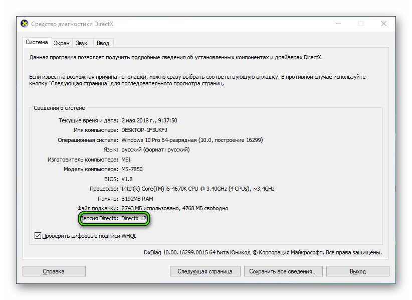В результате будет запущено Средство диагностики DirectX, в котором на вкладке «Система» можно увидеть и версию DirectX. В Windows 10 вы с большой вероятностью увидите там либо DirectX 12 либо 11.2.