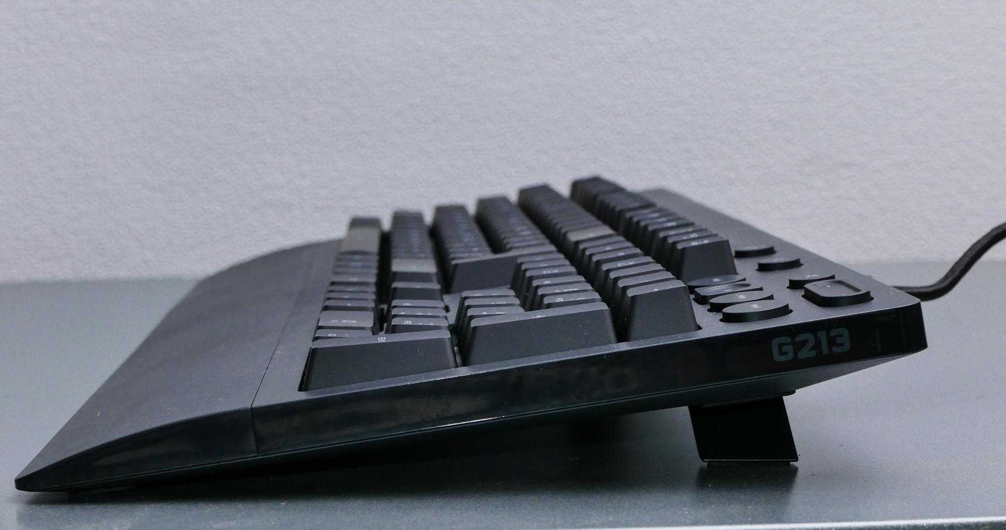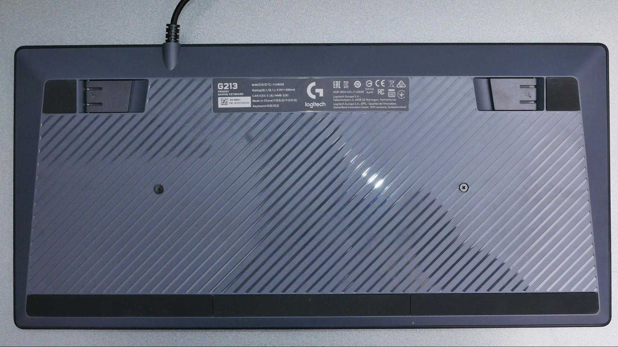 Сзади у Logitech G213 Prodigy есть регулируемые ножки с прорезиненными наконечниками. Когда ножки подняты, сдвинуть клавиатуру очень сложно. Есть два угла наклона, можно выбрать самый удобный.