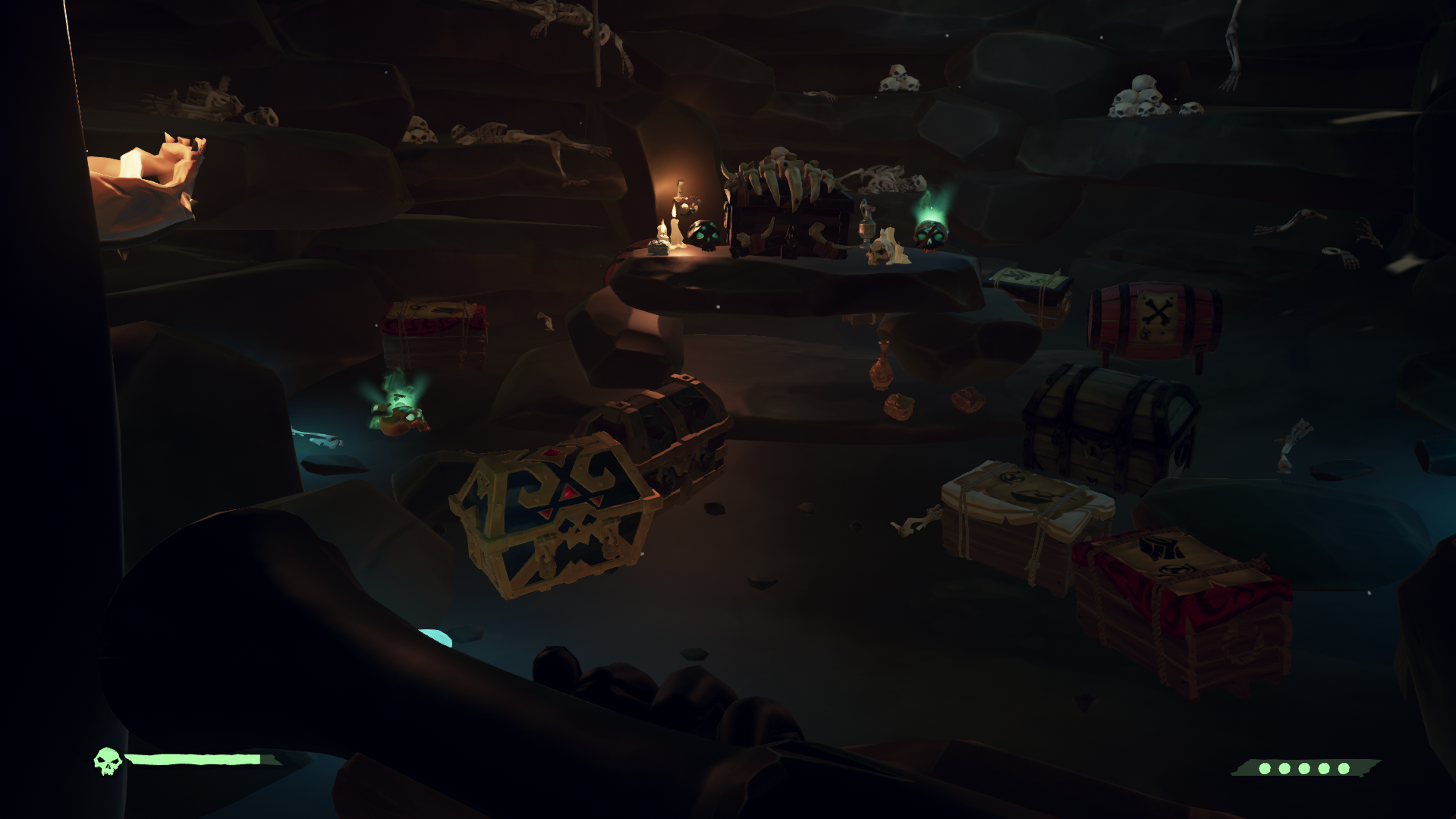 - Плачущий сундук. Находясь на корабле, такой сундук будет рыдать и затапливать ваш трюм слезами, издавая жуткие звуки. Придётся либо постоянно выносить воду с корабля, либо сидеть с сундуком на бортовой лестнице. Когда вы спускаетесь за очередным сокровищем, можно взять плачущий сундук с собой, чтобы корабль не утонул.