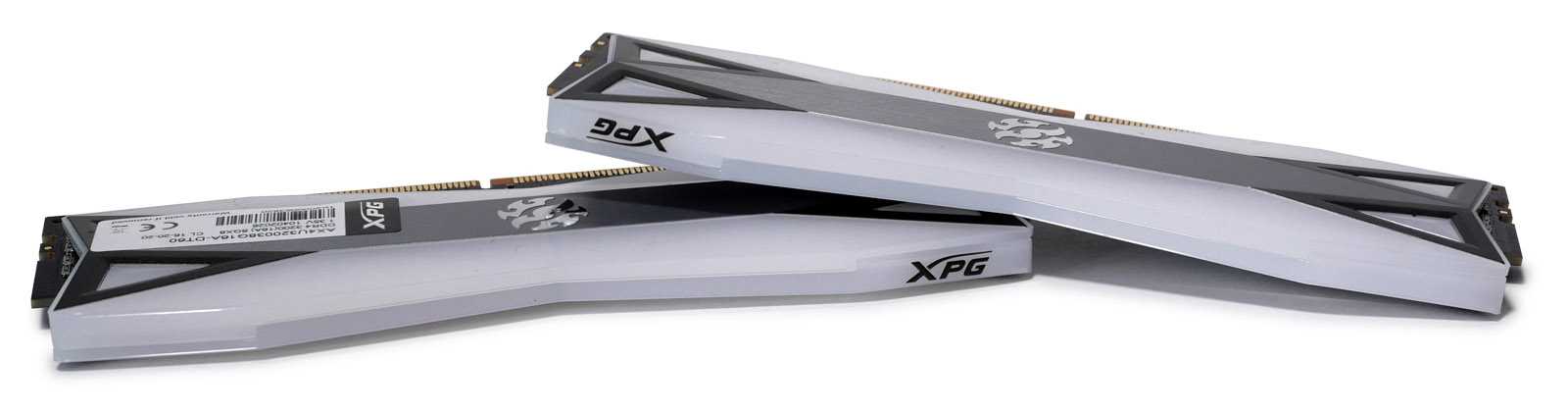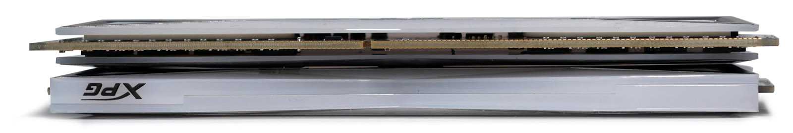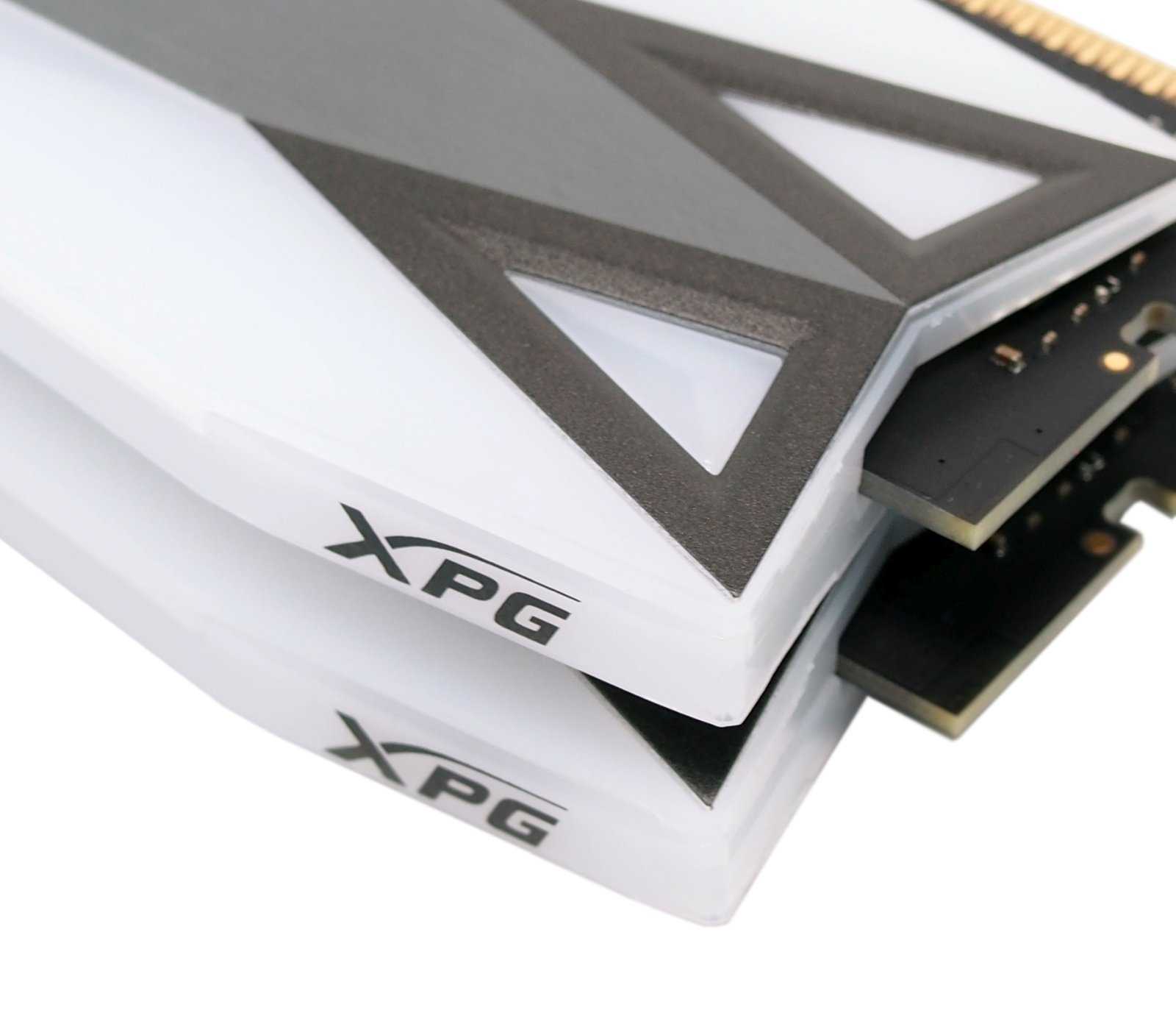 Большая часть поверхности являет собой пластиковый матовый белый полупрозрачный элемент. В середине он дополнен стильной Х-образной алюминиевой вставкой. В самом центре размещен логотип XPG, органично вписывающийся в общий дизайн. Даже при выключенной подсветке модули памяти смотрятся превосходно.