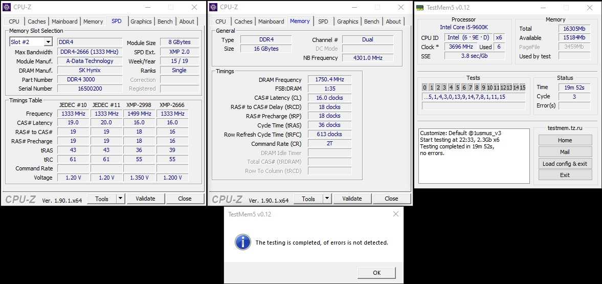 Совсем недавно мы тестировали модули памяти на чипах C-die производства Hynix, которые продемонстрировали неплохой разгонный потенциал. Поэтому на XPG Spectrix D60G DDR4-3000 мы возлагали не меньшие надежды в этом вопросе. И модули памяти не подкачали, показав стабильную работу на частоте 3500 МГц с сохранением таймингов 16-18-18-36-2Т профиля XMP-3000. Максимально возможной частотой оказались 3900 МГц с таймингами 18-20-20-38-2Т. В последнем случае напряжение пришлось увеличить до 1.45 В, что позволило успешно пройти стресс-тест TestMem5 для подтверждения стабильности.