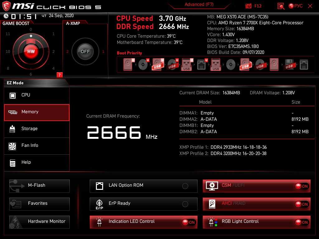 - профиль XMP — 2666 МГц и тайминги 16-16-16-39-2Т;
