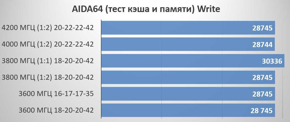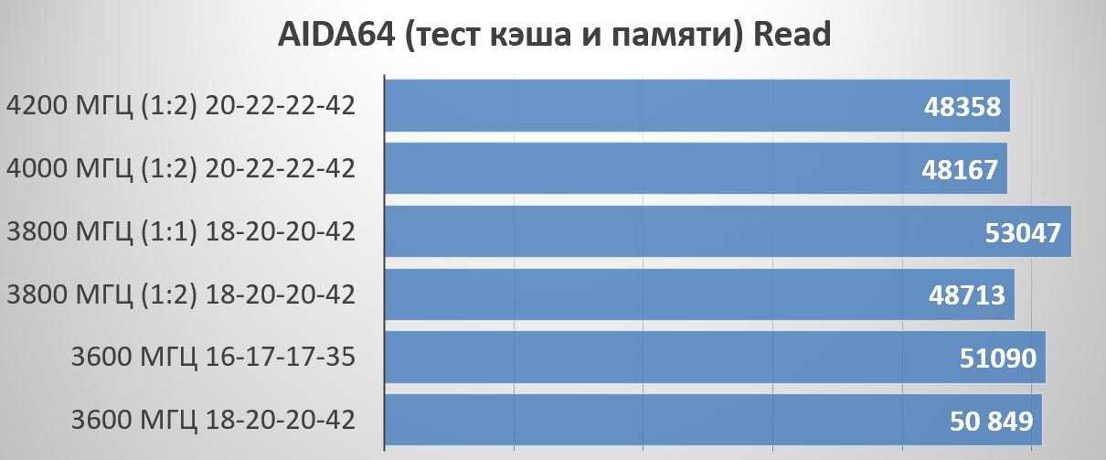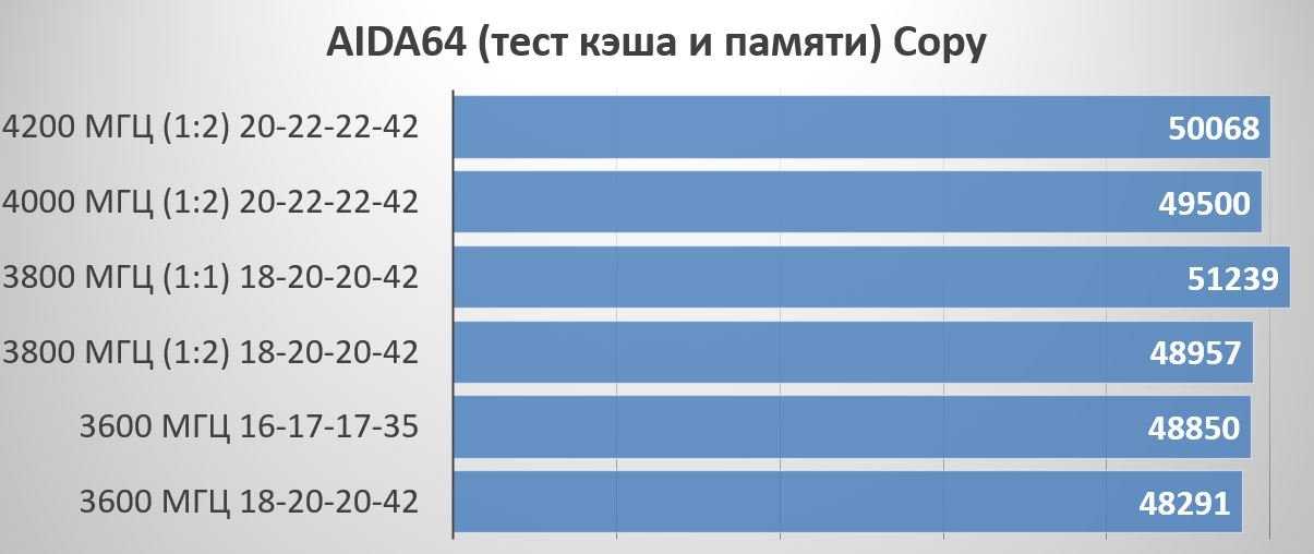 В синтетическом бенчмарке AIDA64 Cache & Memory Benchmark удобно тестировать пропускную способность памяти в зависимости от выбранных таймингов и частоты. Рост скорости операций чтения, записи и копирования неизменно скажется и на общей производительности ПК в различных задачах, активно использующих оперативную память.