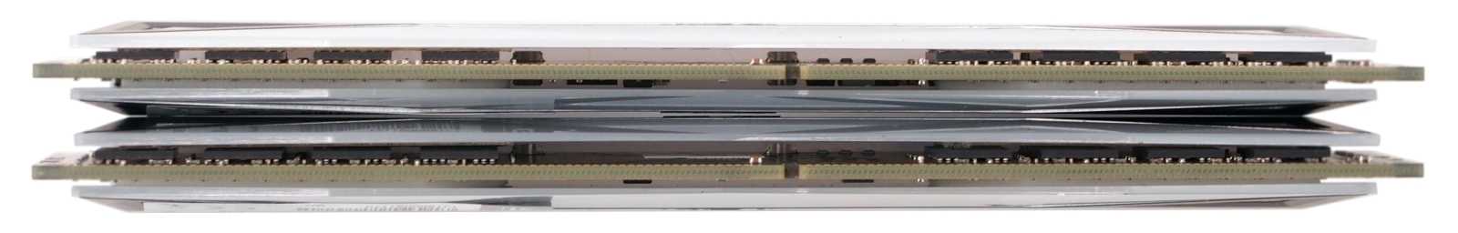 Размещение чипов памяти на печатной плате одностороннее, с использованием восьмислойного PCB-дизайна типа А2 (две группы по четыре чипа, разнесенные к краям). Светодиоды подсветки распаяны ближе к верхней части по пять штук с обеих сторон.