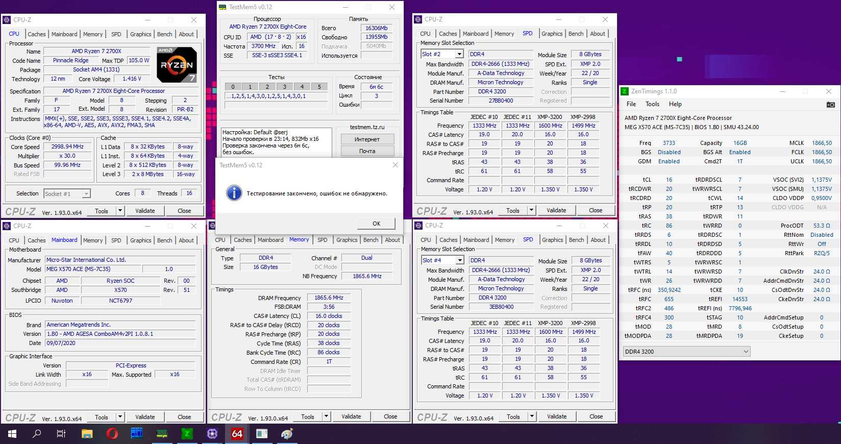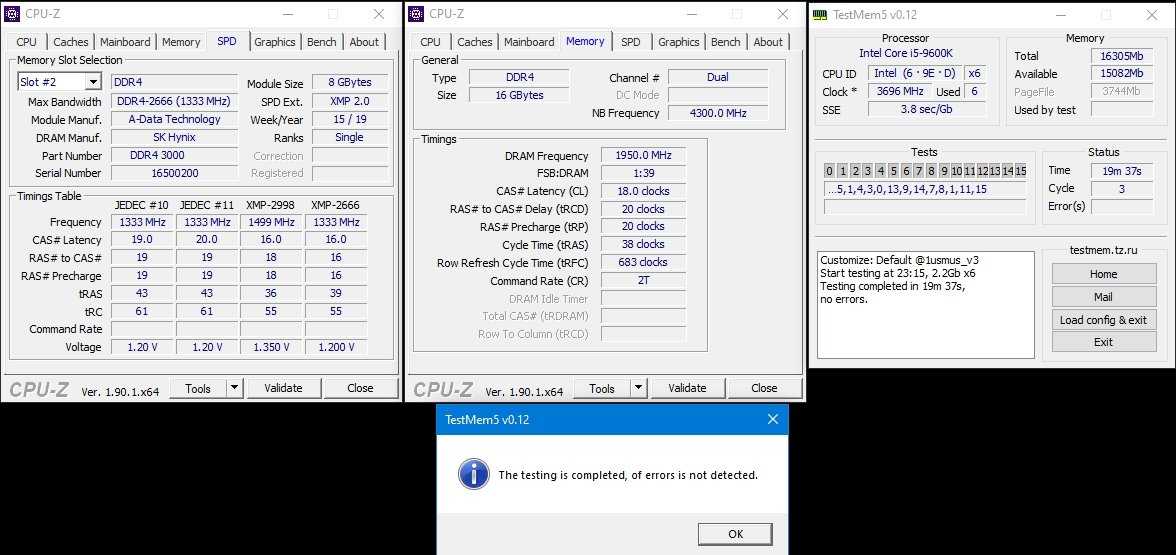 При поднятии таймингов до 20-22-22-39 и экспериментах с повышением напряжения память запустилась и на 3800 МГц, однако не прошла тест на ошибки.