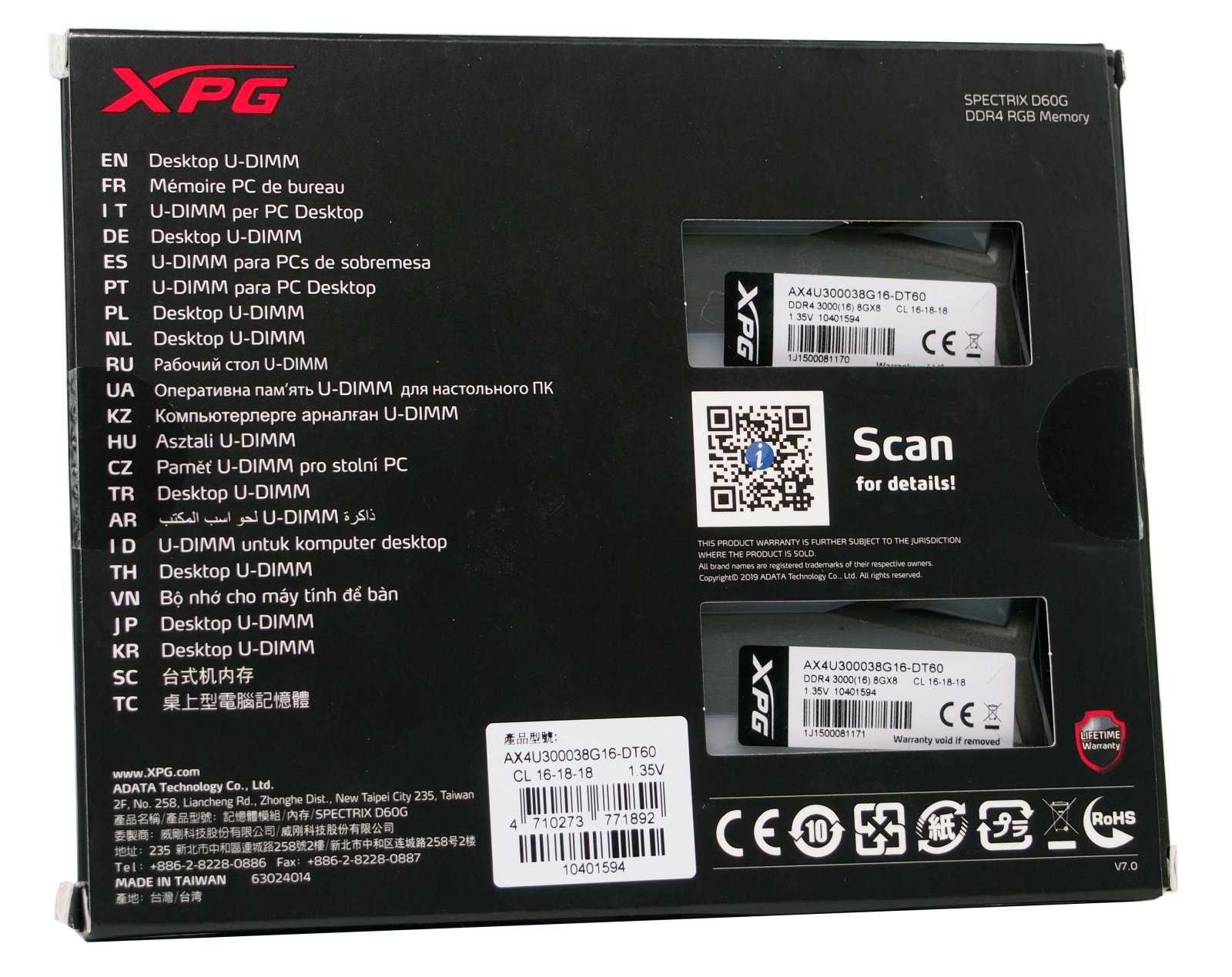 Память XPG Spectrix D60G DDR4-3000 уложена в прозрачный пластиковый блистер, каждый из модулей находится в отдельном отсеке. Производитель предоставляет на память данной серии пожизненную гарантию.