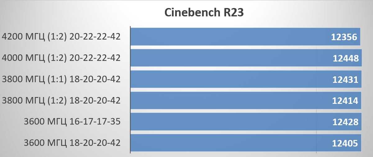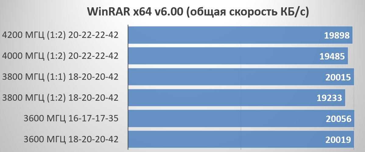 В утилитах WinRAR и Cinebench R23 значительного изменения в производительности при изменении частоты на 200-400 МГц не наблюдается. Такое поведение характерно и для других тестовых программ. Заметный скачок производительности можно отметить только с изменением частоты от 2666 МГц до 3600-3800 МГц.