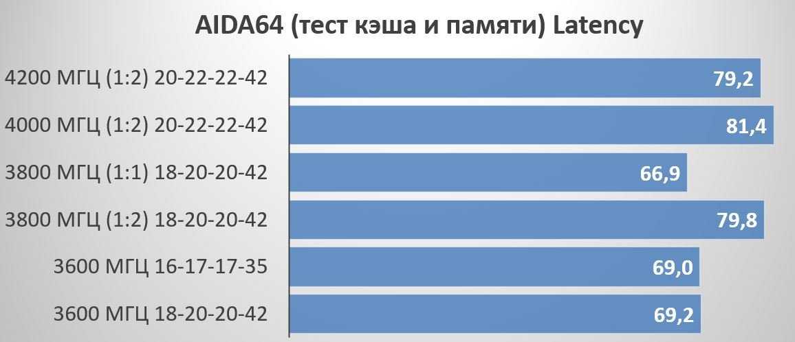 По значениям, полученным в утилите AIDA64, мы видим, что наиболее производительный вариант — при частоте 3800 МГц с частотой шины Infinity Fabric, выставленной вручную на значение 1896,5 МГц, на таймингах 18-20-20 латентность здесь самая низкая.